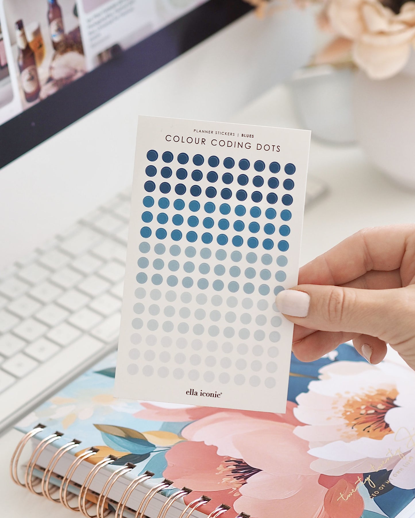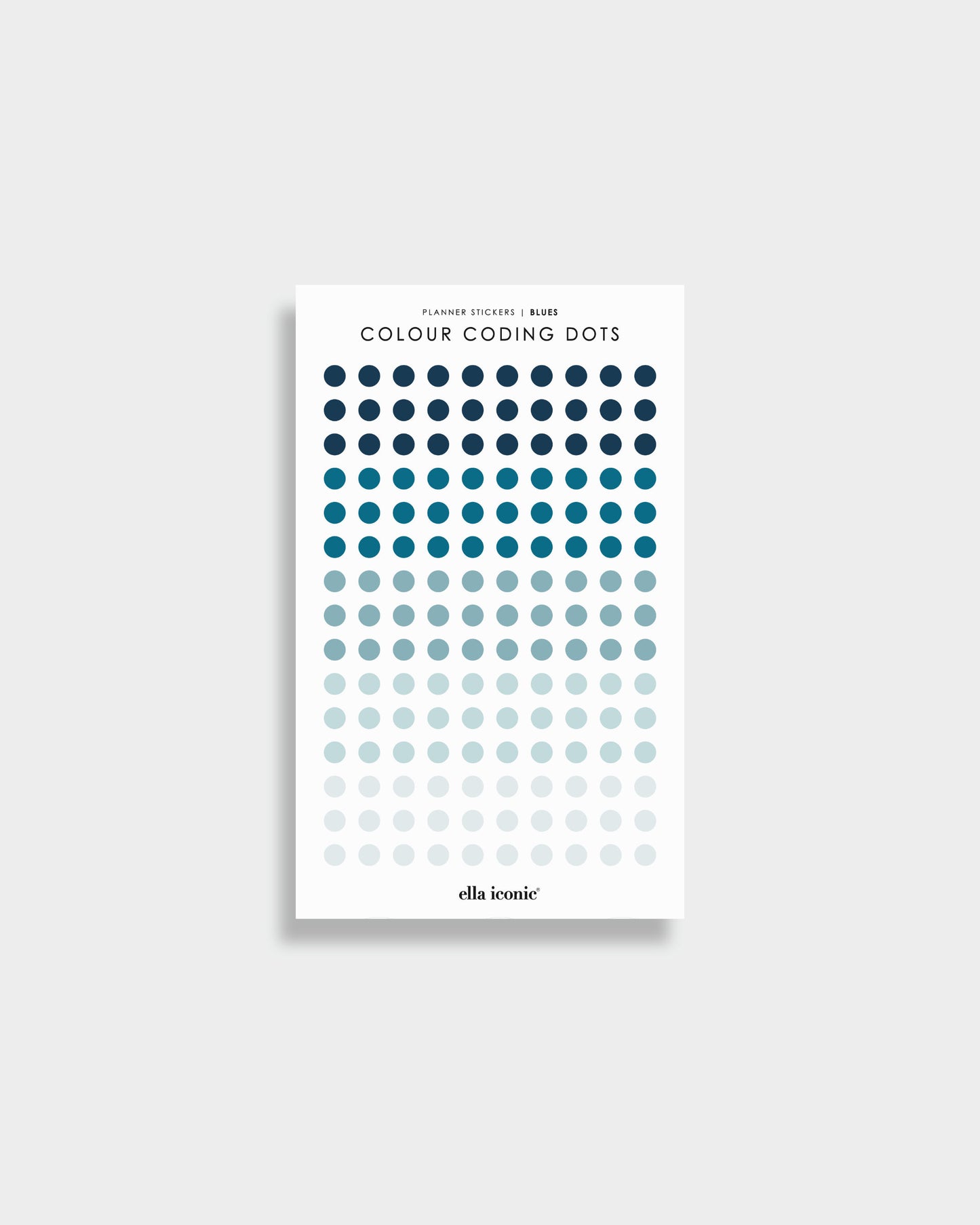 Colour coding mini dot planner stickers in a range of shades of blue.