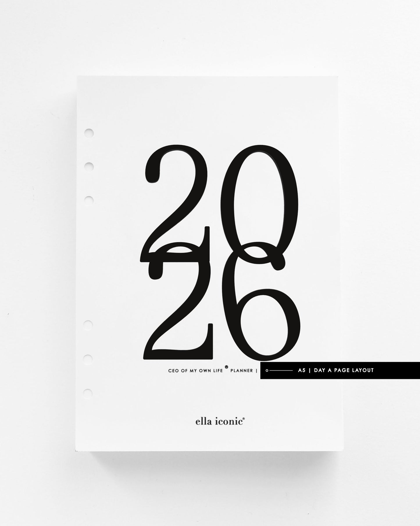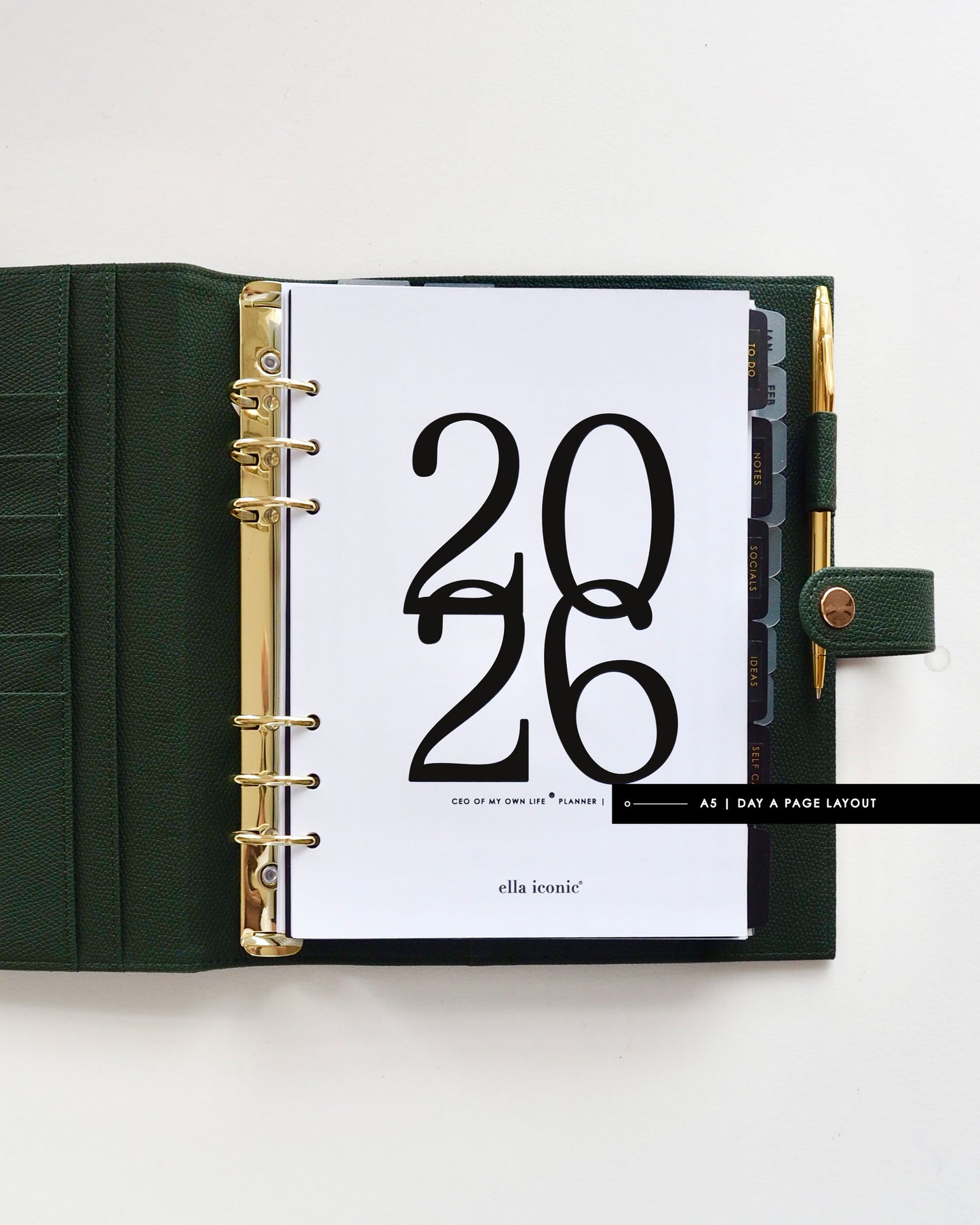 A complete 2026 daily CEO of My Own Life® planner for use with A5 6 ring binders and agendas.
