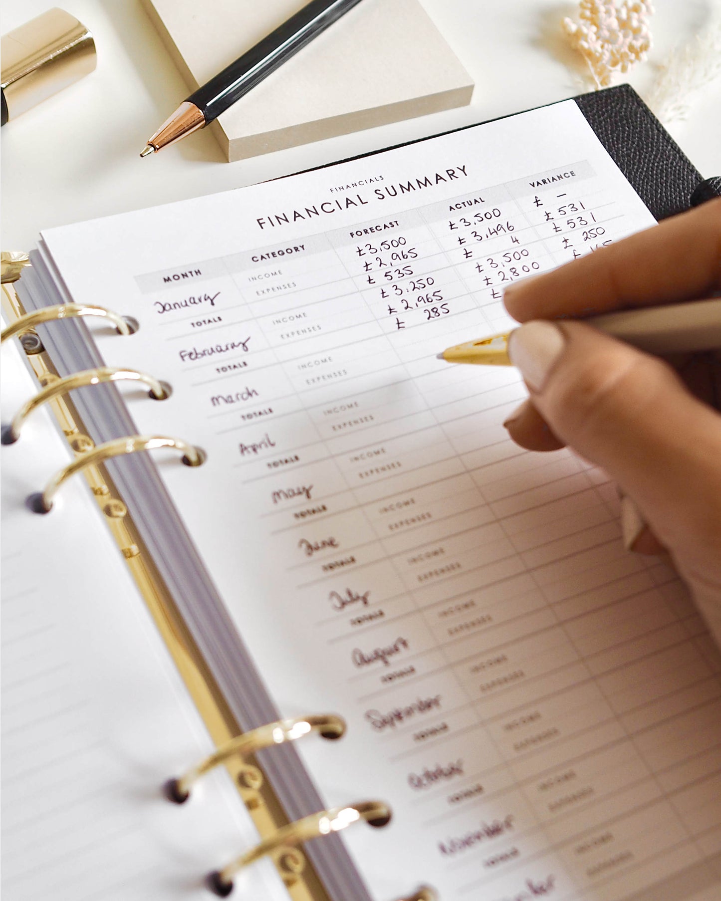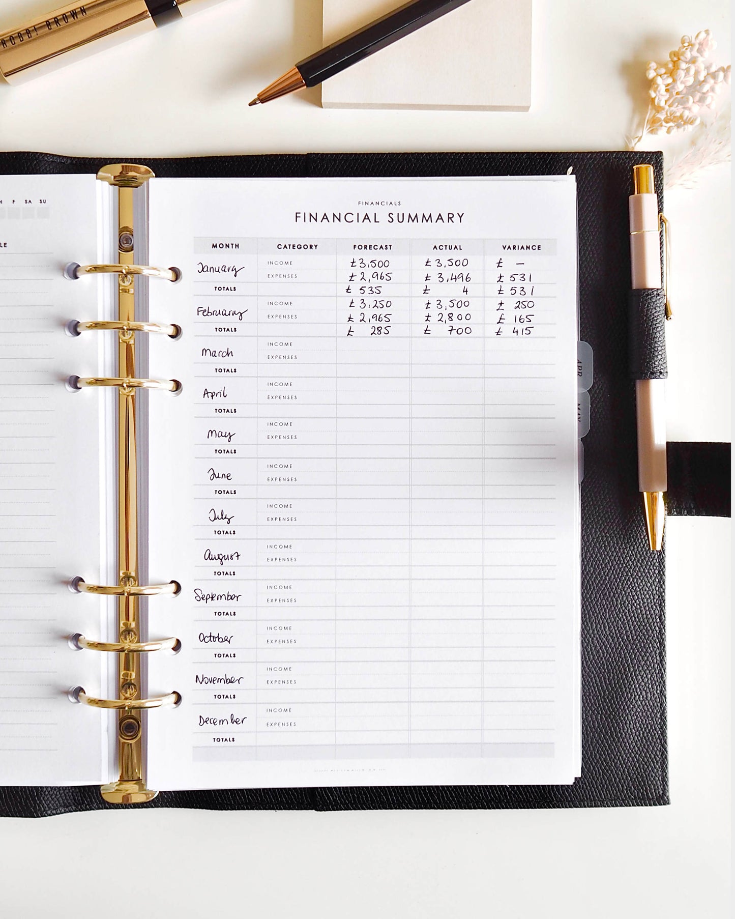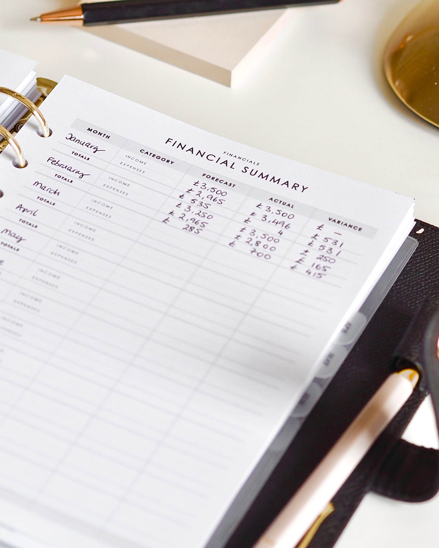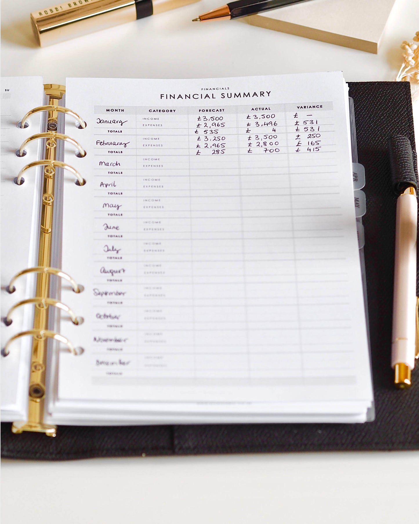Capture your monthly income and expenses to have a month on month view of your financials, be it personal or business. This financial summary is undated, so you can start at any time.