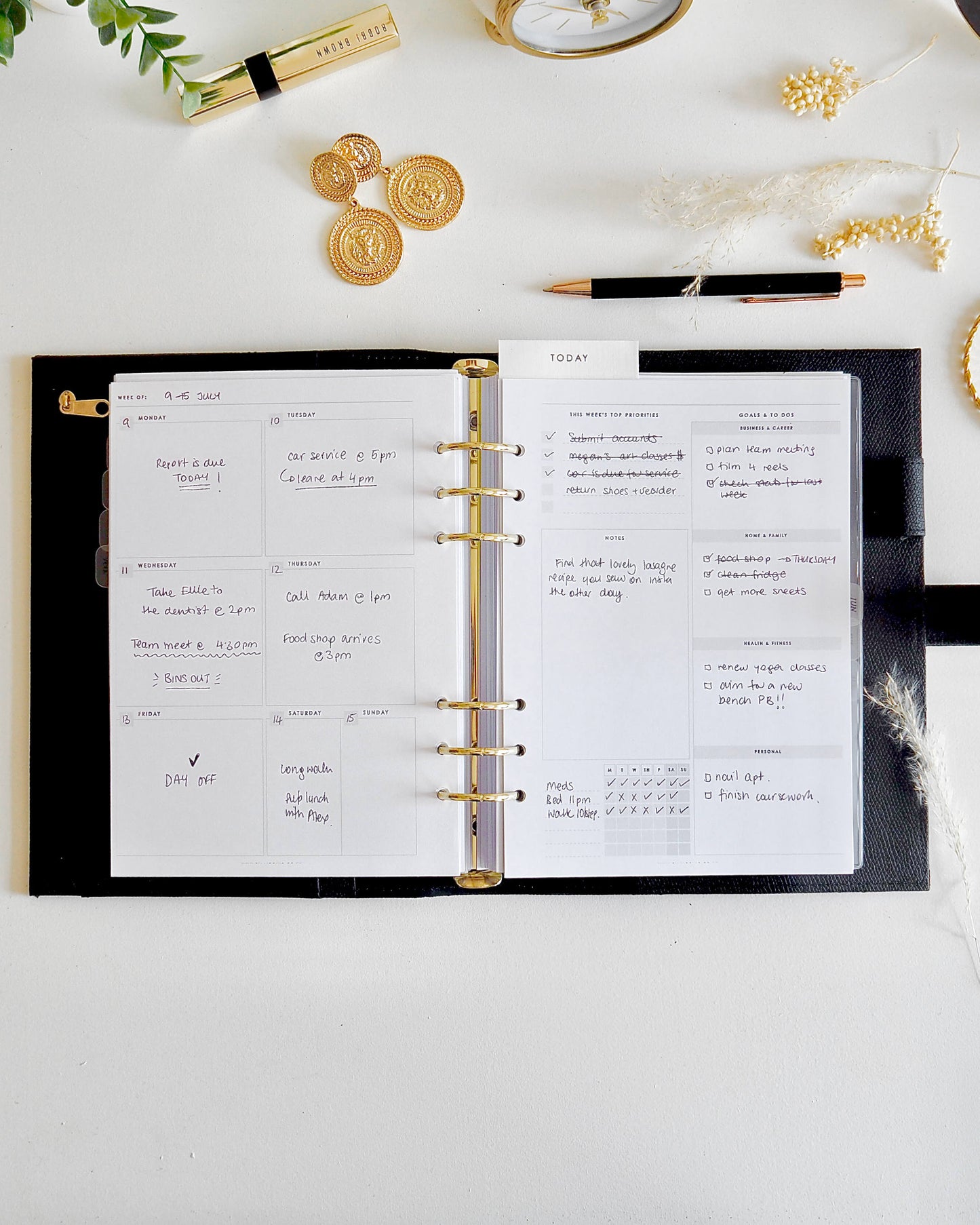 Organise your whole week with an untimed weekly calendar on the left, and all your to-dos, goals and commitments for the week on the right - by work, home & family, health & fitness, and personal life. There are also a section for notes and a mini weekly tracker too (habits, vitamins, etc.)